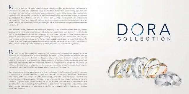 Dora Design is één van de meest gerenommeerde merken in de markt van trouw- en relatieringen. Steeds komt het met een vernieuwende collectie, waarbij kwaliteit hoog in het vaandel gedragen wordt. Bovendien heeft u een uitgebreide keuze tussen verschillende modellen zodat u steeds een trouwring naar uw hart vindt.
