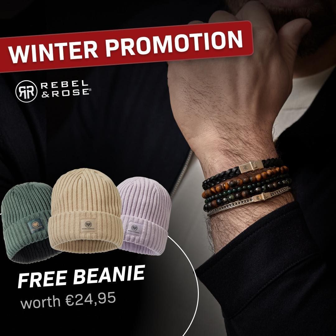 *Zolang de voorraad strekt krijgt u bij elke aankoop vanaf €69 uit het Rebel & Rose gamma een gratis beanie t.w.v. €24,95!