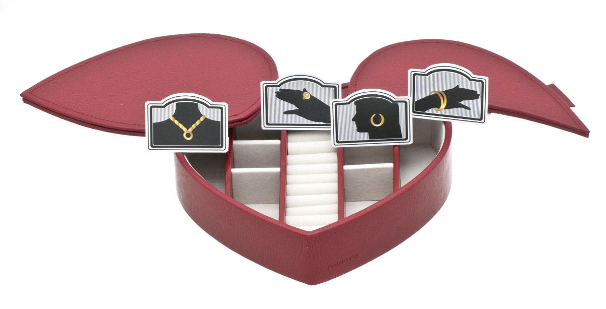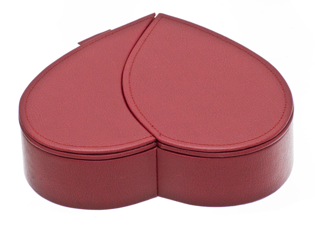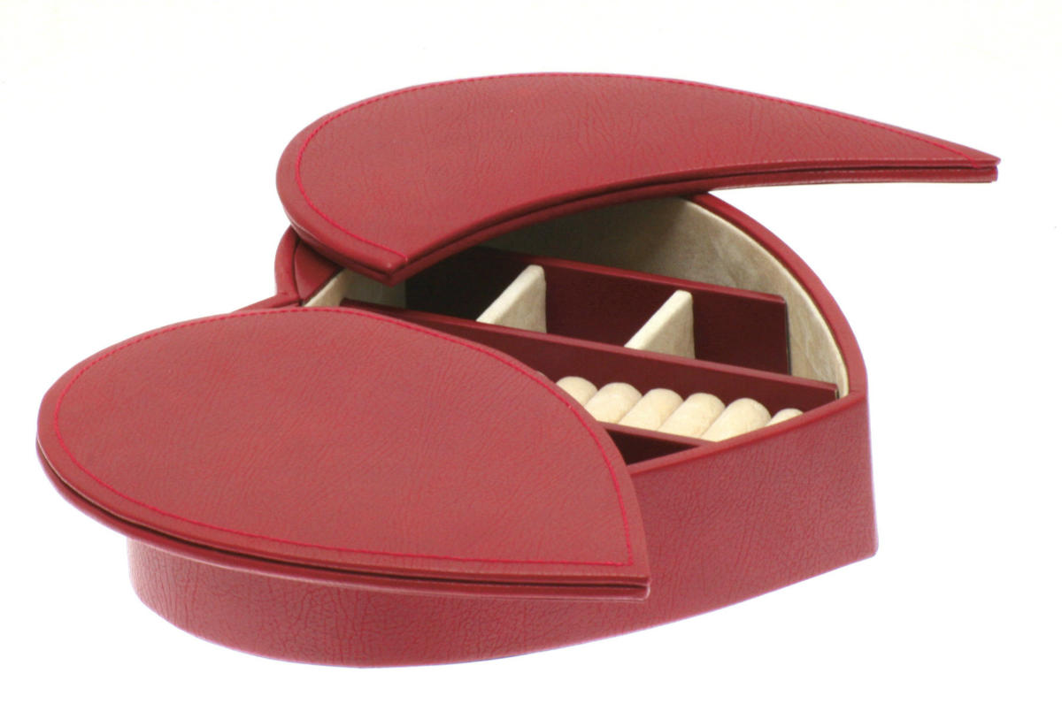 Hartvormig juwelenkistje van het merk Davidt's in kunstleder met witte velours voering voor dames - kleur: rood (verkrijgbaar in meerdere kleuren) - het juwelenkistje bevat verschillende opbergvakken - Afmetingen: 200mm x 170mm x 55mm