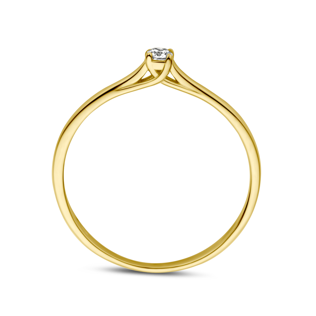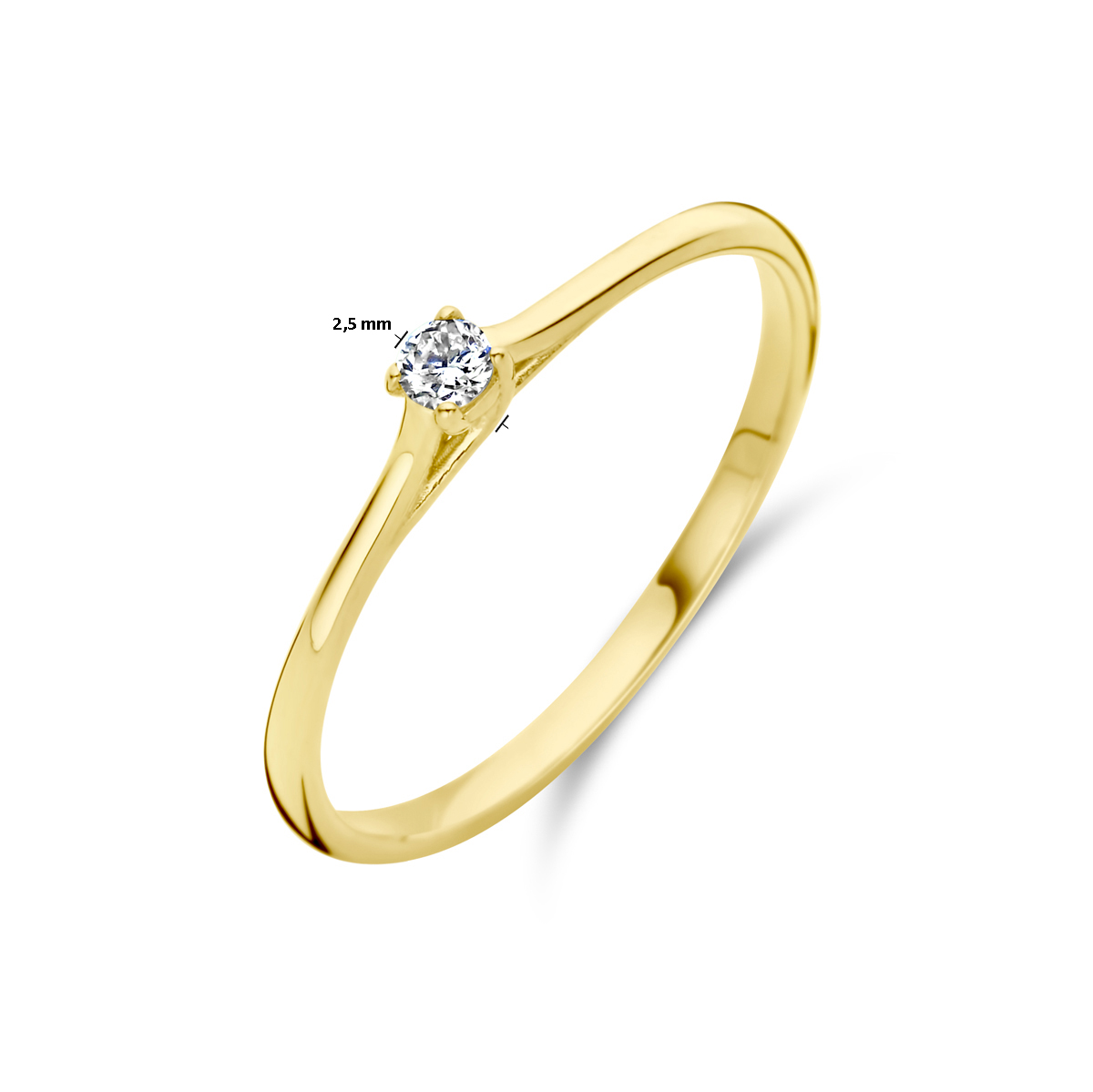 14k Geelgouden ring uitgevoerd met diamant. De ring heeft een breedte van 2.5mm.