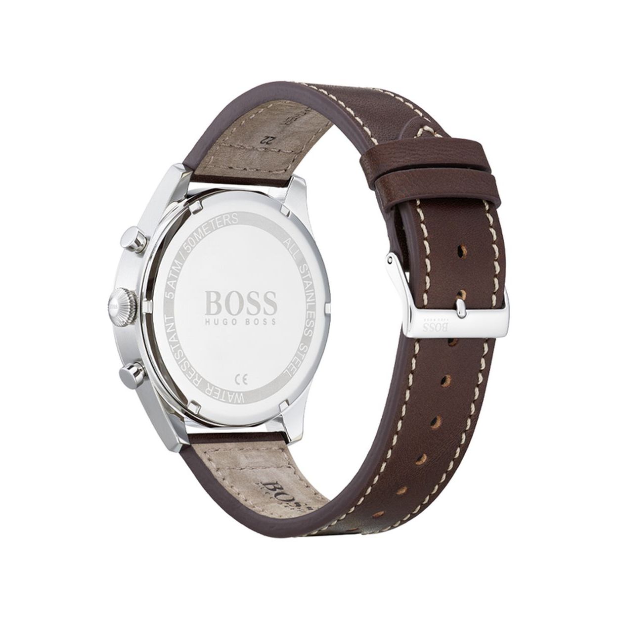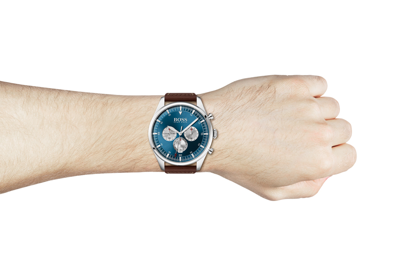 Hugo Boss herenuurwerk uit de 'Pioneer' collectie - Bruine lederen band, stalen kast - Blauwe wijzerplaat 'multifunctie' met datumaanduiding - Chronograaf - Waterdichtheid: 5 ATM