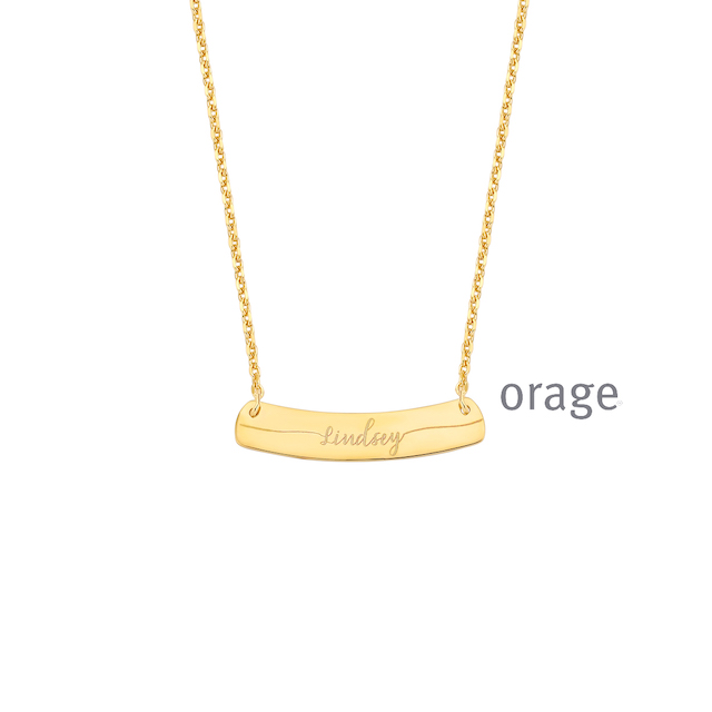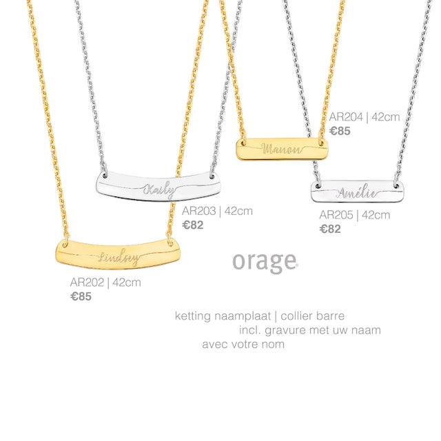 Goudkleurige ketting met naamplaat, verkrijgbaar met rechte of gebogen naamplaat (zie foto's) - Lengte ketting: 42 cm - Ook verkrijgbaar in zilverkleurige versie - Steeds op bestelling gezien de personalisatie van de naamplaat! - Levertijd: ongeveer 1 week - Vermeld bij uw bestelling de gewenste vorm van de naamplaat en de naam - Let op! Gezien dit een gepersonaliseerde bestelling is kan deze niet geretourneerd worden, u kan deze ketting met gravure altijd eerst komen bekijken in onze winkel.