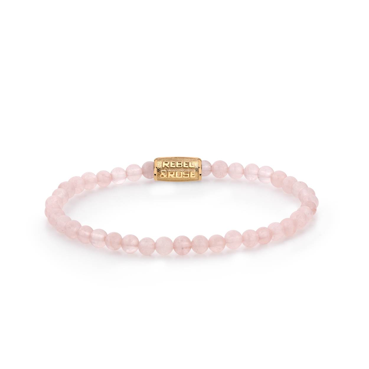 Edelstenen bead armband, handgemaakt van 4mm Rozenkwarts stenen met een 18 karaat goud ion-plated sluiting. Het Rebel & Rose sieraad is makkelijk te combineren met onze andere kralenarmbanden.