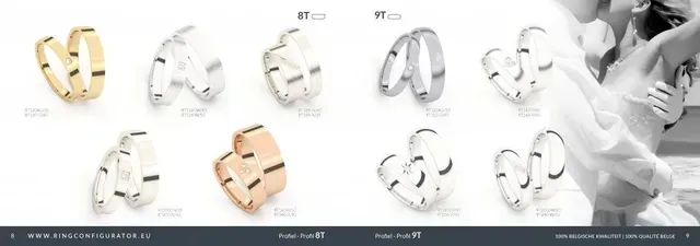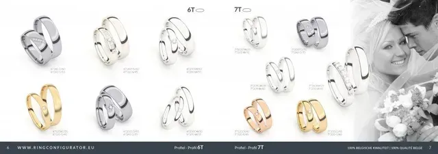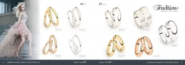 Kies uit 6 klassieke vormen (4T, 5T, 6T, 7T, 8T, 9T) van strak tot rond, en zoek de ring uit die je het beste aanpast. Vervolgens heb je de keuze uit het materiaal en de kleur waaruit je ring gemaakt wordt. Goud (18K, 14K) in geel, wit, champagne (naturel wit), of rood goud. Platina in zilverwit en palladium (Pd500) in lichtgrijs.